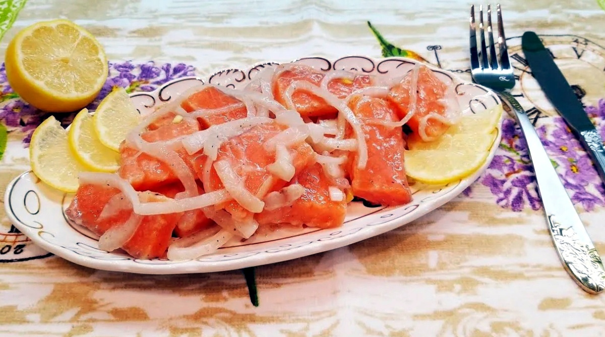 Семга, маринованная кусочками с луком за 15 минут