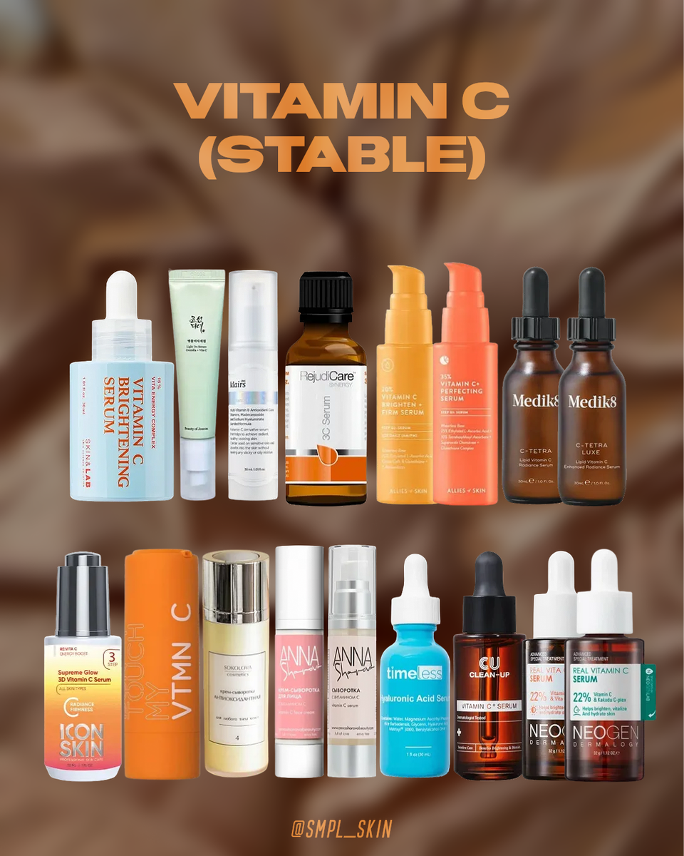 Стабильные формы витамина С отличаются от кислой формы тем, что они менее восприимчивы к внешним факторам, таким как воздух и свет, что делает их более устойчивыми в составе косметических средств. Их главный плюс — мягкость воздействия. Такие формы витамина С реже вызывают раздражение и являются более подходящими для использования людьми с чувствительной кожей.