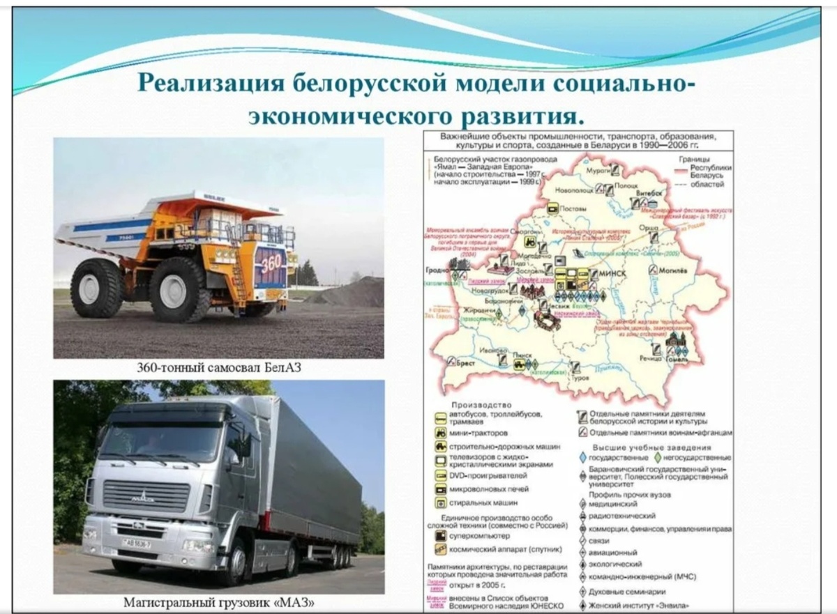 - Разработка и реализация белорусской модели социально-экономического развития. В качестве национальной модели развития Республики Беларусь определена социально ориентированная рыночная экономика, которая должна сочетать преимущества рыночной конкуренции и эффективной системы социальной защиты, идеи рыночного саморегулирования и государственного управления.