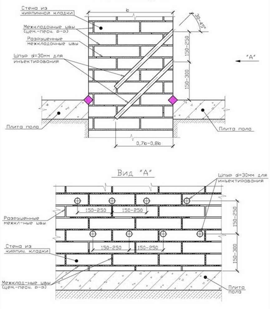 1. Пробуривание инъекционных шпуров, в шахматном порядке, по обе стороны от рабочего (холодного) шваD10-D30 мм Пробурить инъекционные шпуры диаметром D10-30 мм. Шпуры располагают равномерно по инъецируемому участку, под углом в 45° от лицевой поверхности конструкции. Шпуры пробуриваются таким образом, чтобы они пересекали трещину или шов по середине её глубины. Длина шпуров составляет 2/3 толщины конструкции, но не более 450 мм. Расстояние между шпурами и их отступ от трещины составляет 150-200 мм. 2. Установка инъекторов Инъекционные каналы очистить от осыпавшегося материала и пыли промышленным пылесосом или продуть с использованием пневматического оборудования. При продувке важно прочистить каналы на всю их глубину и использовать оборудование, исключающее возможность загрязнения воздуха машинным маслом. Металлические инъекторы забиваются поочередно в уже пробуренные отверстия. Устанавливают в отверстия диаметром 10-30 мм. 3. Инъецирование кирпичной кладки. Смешать и произвести и