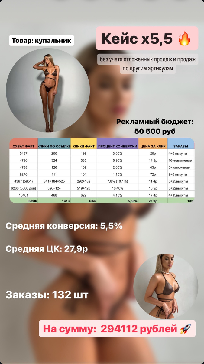 В этой статье я вам расскажу историю своего кейса. Скажу вам честно , что изначально браться за закуп этих купальников я не хотела: своеобразный дизайн, короткий сезон, новая карточка товара, органических продаж нет. Требовалось найти блогеров с идеальными фигурами, которые согласились бы показать его на себе во всей красе. Многие отказывались от данного товара, поскольку трусики были высокой посадки - узкие стринги, верх - на завязках. Не всем подходят такие купальники) Благодаря тому, что с заказчицей мы работали в формате доверия и полного взаимопонимания - она учла все советы по подготовке карточки к рекламе . Я написала суперпродающее ТЗ, которое показало главные преимущества товара и благодаря этому я добилась таких показателей: Затраченный бюджет 50.500, 7 публикаций в формате сторис. Лучше всего сработали рекламы у фитнес блогеров с идеальными фигурами, где присутствовал красивый визуал и вовлеченная аудитория. Я адаптировала техническое задание, добавила в рекламную подачу наг