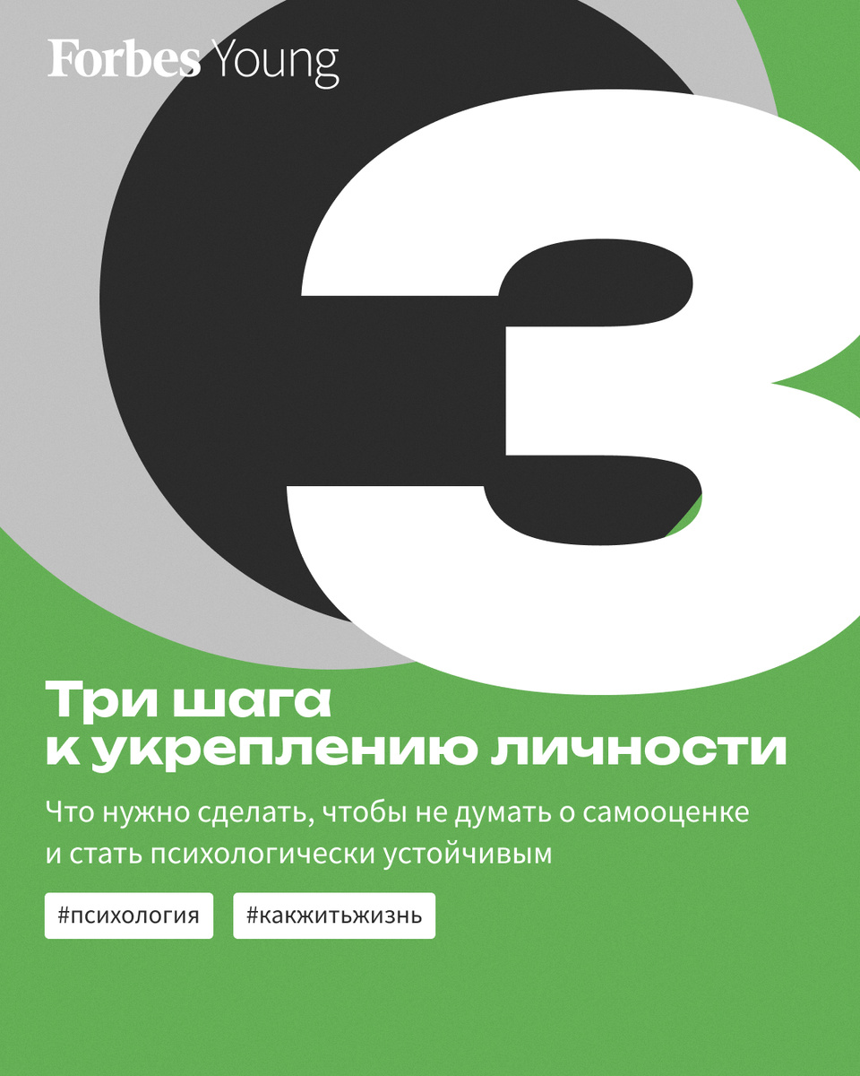 В шестом выпуске нашего подкаста «Как жить жизнь? | FOMO и YOLO» говорим о синдроме самозванца — миксе тревоги, перфекционизма и низкой самооценки. Если высокая самооценка зависит только от достижения успеха, это приводит к постоянной внутренней критике и страху совершить ошибку. Клинический психолог и экзистенциальный психотерапевт Маргарита Даревская советует не гнаться за повышением самооценки, а работать над укреплением личности и психологической устойчивостью. Следствием этого и будет растущее чувство собственной ценности. В карточках собрали три универсальных шага к укреплению личности, которые выделяет Даревская. А выпуск можно послушать на сайте Forbes, на Apple Podcasts, в YouTube, на «Яндекс Музыке» или на других платформах. Шаг 1 Обращать внимание на себя Мы видим себя в зеркале каждый день, но значит ли это, что мы внимательны к себе? Люди живут на высоких скоростях и годами могут не обращать на себя внимания. Замечать себя — значит развивать навык самонаблюдения и б