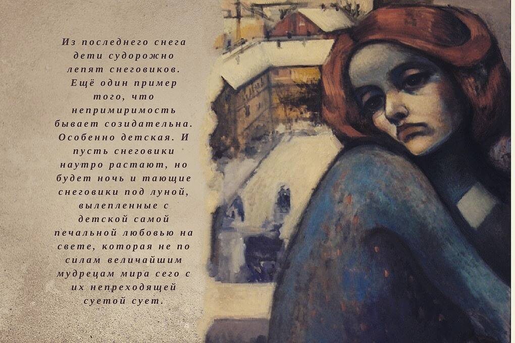 Запах чистоты с нотой горечи. Одна из вещей, в которой не сомневаешься. --- Душа человеческая слишком глубока, чтобы быть прозрачной. --- Цветные фотографии теперь кажутся настоящими лишь, когда зернисты. Гладь никого не может удержать. --- Когда говорят о голосе, как о сокровище, я слышу голос Лизз Райт. --- Я боюсь доброты. Как будто оборванцу целует руку королева. --- Модно говорить, что любишь музыку. Говорят многие, слушают единицы, слышит лишь играющий. --- Я не знаю, что такое меланхолия, то, что нужно искать или то, что уже найдено. --- Чем больше пишу, тем больше слышу то, что остается невысказанным. И это почти всегда оказывается единственным, что нужно было сказать. --- Свободный отпускает. Несвободный убивает.