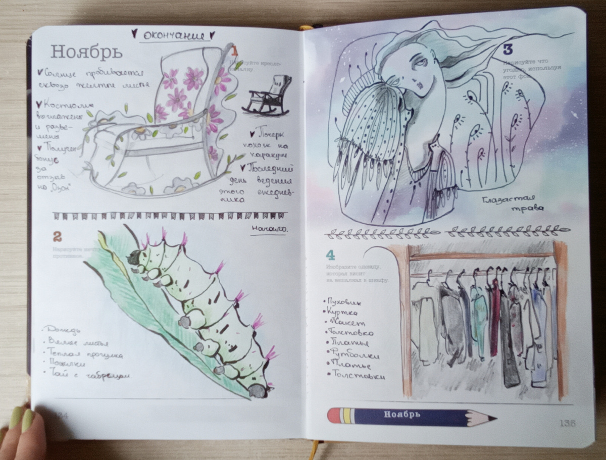 Всем чернично-космический привет! Ровно год назад я стала делиться своими зарисовками из Sketch-ежедневника. На тот момент он был уже закончен, и я просто делала каждый месяц подборки, на мой взгляд, самый удачных скетчей. Сегодня я все же решила полистать полностью законченный творческий ежедневник и немного рассказать о нем. Начала вести блокнот в ноябре 2021 году, буквально сразу как только распаковала посылку. Не стала дожидаться нового года: нетерпелось приступить. К тому же даты не проставлены, поэтому можно начать когда захочется. Сразу решила, что к рисуночкам буду добавлять небольшие заметки, что-то вроде дневниковых записей. Где-то писала и интересные факты о рисуемом объекте. Или воспоминания из прошлого. Поначалу старалась вести ежедневник прилежно, не пропуская ни дня. Но через несколько месяцев стала пропускать и даже выполнять задания в стиле "кое-как, лишь бы заполнить день". А всему виной банальная нехватка времени. Да и вдохновение и настроение были не всегда. Нек
