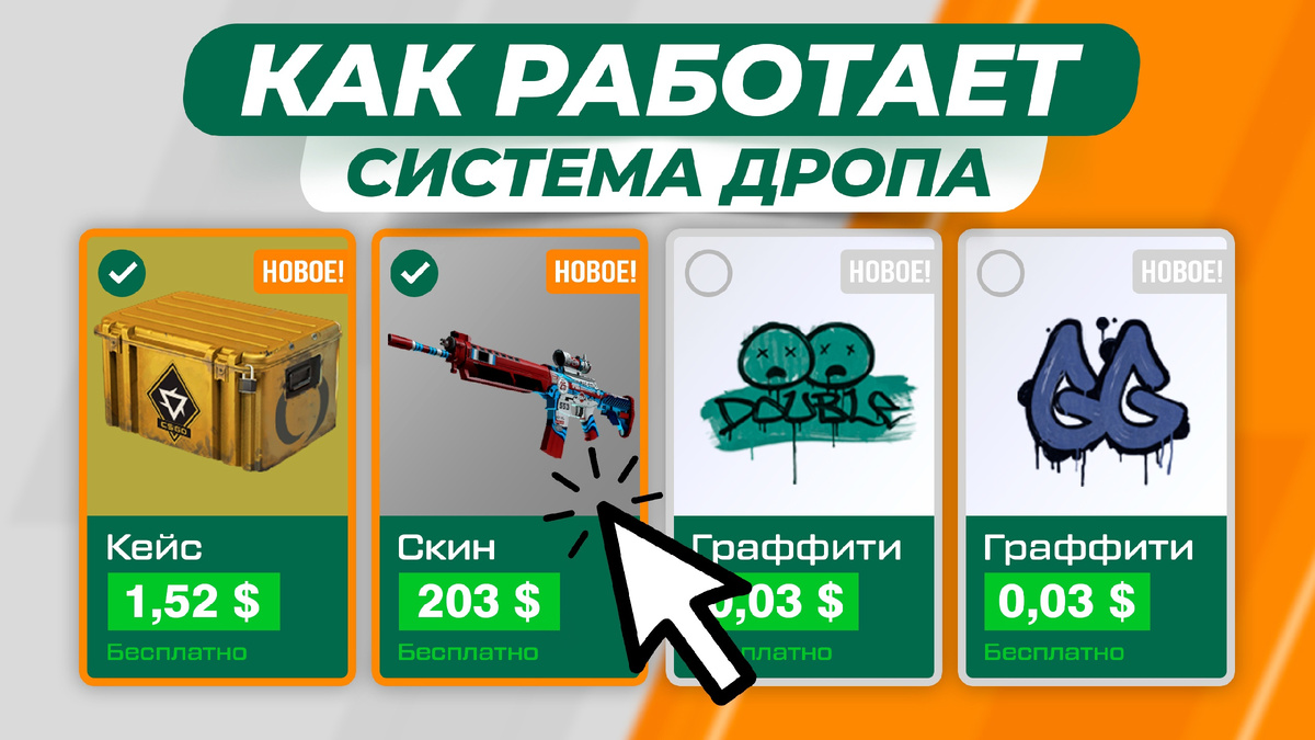Подписывайтесь на мой ТГ https://t.me/apenewell Еженедельный дроп в кс доступен каждому игроку, у которого приобретен прайм статус. Получить дроп игрок сможет после того как повысит уровень 🎉, для этого достаточно просто играть на официальных серверах, больше всего опыта дают за игры в ММ, но и длятся они дольше. После повышения уровня вы сможете выбрать 2 из 4 предметов на выбор, обычно это 1 кейс, 1 или 2 скина и 1 или 2 граффити. С граффити все просто, они почти ничего не стоят, за исключением 5-10 из всего пула граффити, что достаточно маловероятно выбить. И даже если вам повезет, то речь будет идти о 200-400 рублях. Из интересного, вам может выпасть солонка или свинка, они, конечно, не дорогие, но заимев их в инвентарь, вы сможете глумиться над противниками😄