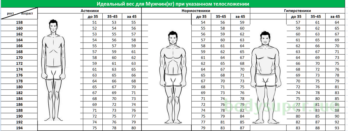 Каждый человек хоть раз в своей жизни задумывался об идеальном весе . На психологическом уровне среднестатистический человек понимает некоторые вещи, но не может их объяснить. Например то, что не хорошо быть совсем худым или совсем толстым. В данной статье рассмотрим все, что касается веса человека, а именно соотношение мышечной массы и процента жира в организме, а так же идеальный вес для конкретного роста. Слишком худой человек — человек нездоровый по факту. В теории, у него может и не быть проблем со здоровьем, но глядя на такого человека в голову приходят лишь мысли о том, что он болен. Это животная оценка, на уровне инстинктов (так же как девушка с очень узким тазом на психологическом уровне кажется не подходящей для материнства). Следовательно, худой человек уже не обладатель идеального веса. Вопрос лишь в том, как определить действительно худого человека. Есть много различных формул и процентных соотношений, но они настолько усреднены, что писать о них нет смысла. Как пример, нигде не учитывается разная плотность (тяжесть) костей. Поэтому определять худого человека куда проще на глаз, Вы точно не ошибетесь. Конечно, если Вы не большой и мощный пауэрлифтер, для которого все окружающие мелкие и худые. Например, мужчина ростом 175 см и весом 55 кг — это нездорово худой человек (или девушка при росте 165 см и весом 40 кг). Если такой мужчина при этом не обладает внушительной шириной плечевого пояса относительно узкой талии, то он будет казаться совсем хилым и щуплым. Слишком толстый человек — человек нездоровый по факту. Жировая прослойка в определенном процентном соотношении просто жизненно необходима. Именно поэтому её отсустствие вызывает мысли о нездоровье худого человека. Но избыточное количество жира не менее страшно. У всех полных людей проблемы с сердцем, часто с суставами, и прочее, прочее. Полнота является для тела избыточным весом, к которому ни сердце, ни другие органы, ни суставы не приспособлены. Полноту определить еще проще, чем просто худого человека. Здесь точно не нужны никакие формулы и подсчеты. Полным человеком можно считать мужчину ростом 175 см и весом 85 кг (девушка 165 см и весом 65). Чем больше вес при таком росте, тем ближе это к ожирению, тем соотвественно дальше от идеального веса. Главное не перепутайте просто толстого человека и здорового мощного мужчину-пауэрлифтера или бодибилдера в глубоком межсезонье. Посмотрите на ноги, в особенности на икры, тогда сразу станет ясно, лифтер перед вами или просто толстый мужик. То что мы рассмотрели выше про полных людей — это так сказать процент жира в организме без учета мышечной массы. То есть мужчина при весе 175 см и весом 85 кг, при должной мышечной массе, на самом деле настоящий атлет, причем хорошего уровня. Более того, если мы берем для тела большой избыточный вес, например свыше 100-110 кг, это большие проблемы со здоровьем у полных людей. Но если мы возьмем атлета такого же веса с нормальной, средней жировой прослойкой, то он вполне здоров. Суставы как нельзя лучше подготовлены к такой большой массе тела, сердце так же адаптировано к нагрузкам. Такой человек по-настоящему силен и снаружи и изнутри. К тому же визуально такой человек будет очень мозно сложен. А вот толстый человек будет куда более несуразным, особенно без одежды. Тем более жир весит куда легче мышц, следовател