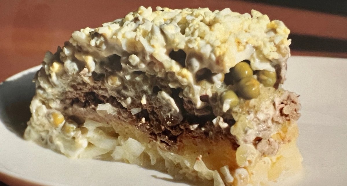 третьим- измельченную куриную печень, далее измельченные соленые/ маринованные огурцы,