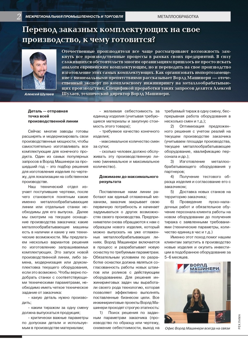 Отечественные производители все чаще рассматривают возможность замкнуть все производственные процессы в рамках своих предприятий. В силу сложившихся обстоятельств многим организациям пришлось не просто искать аналоги европейским комплектующим, но и переводить на свое производство изготовление этих самых комплектующих. Как организовать импортозамещение с минимальными препятствиями рассказывает Ворлд Машинери — отечественный эксперт по комплексному инжинирингу на металлообрабатывающих производствах. Спецификой проработки таких запросов делится Алексей Шулаев, технический директор Ворлд Машинери. Деталь — отправная точка всей производственной линии Сейчас многие заводы готовы расширять и модернизировать свои производственные мощности, чтобы самостоятельно изготавливать все комплектующие для конечного продукта. Один из самых популярных запросов в Ворлд Машинери за прошедший год — это подбор решения для изготовления изделия по чертежу, для локализации на собственном производстве.