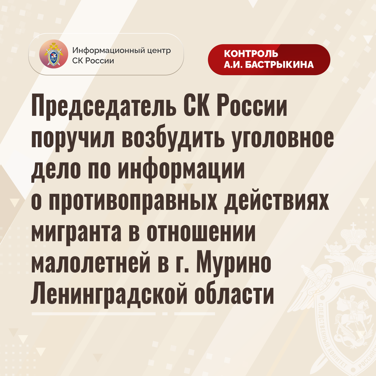 Председатель СК России поручил возбудить уголовное дело по информации о противоправных действиях мигранта в отношении малолетней в г. Мурино Ленинградской области В телеграм-канале сообщается, что 27 августа текущего года в подъезде одного из многоквартирных домов в г. Мурино Ленинградской области подросток-мигрант изнасиловал малолетнюю. В СУ СК России по Ленинградской области организована процессуальная проверка. Председатель Следственного комитета Российской Федерации Александр Иванович Бастрыкин поручил и.о. руководителя СУ СК России по Ленинградской области Дмитрию Юрьевичу Митяеву возбудить уголовное дело и представить доклад о его предварительных и окончательных результатах расследования. Исполнение поручения поставлено на контроль в центральном аппарате ведомства. #СледственныйКомитет #СКРоссии #СКР #ИЦСКР #ИнформационныйЦентр #АлександрБастрыкин #ПредседательСКР #КонтрольПредседателяСКР #КомментарийКонтроль #ЛенинградскаяОбласть