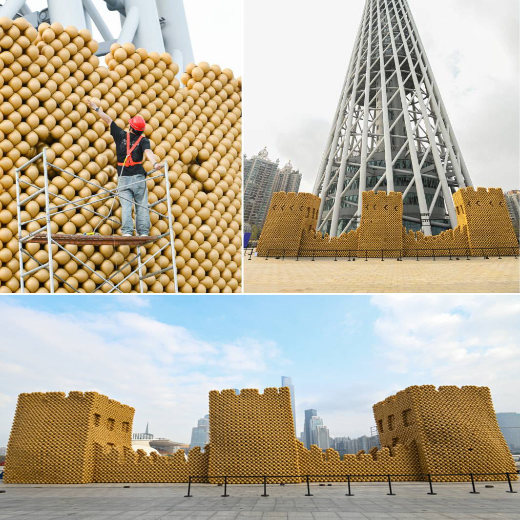 "Самую большую копию достопримечательности, созданную из воздушных шаров" торжественно внесли в Книгу рекордов 22 февраля 2024 года. Гигантскую Великую китайскую стену из 100 000 золотых воздушных шаров построили в городе Гуанчжоу (население более 15 мл человек, - прим.ред.) рядом с современной достопримечательностью - Кантонской телебашней*. Композиция из шаров объединила два знаковых для Китая сооружения разных эпох и сама по себе стала удивительной точкой притяжения для жителей и гостей Гуанчжоу. По словам менеджера Кантонской башни, это было первое столь масштабное событие в городе после встречи Лунного нового года. Проект инициировала Китайская ассоциация здоровья пожилых людей и организовал "Деловой вестник 21 века" в рамках мероприятий Недели осведомленности о Herpes Zoster* (опоясывающем лишае), проводившейся в третий раз. Организаторы посчитали, что благодаря масштабной шаростройке и рекорду Гинесса к здоровью пожилых людей будет привлечено больше внимания: они призвали людей