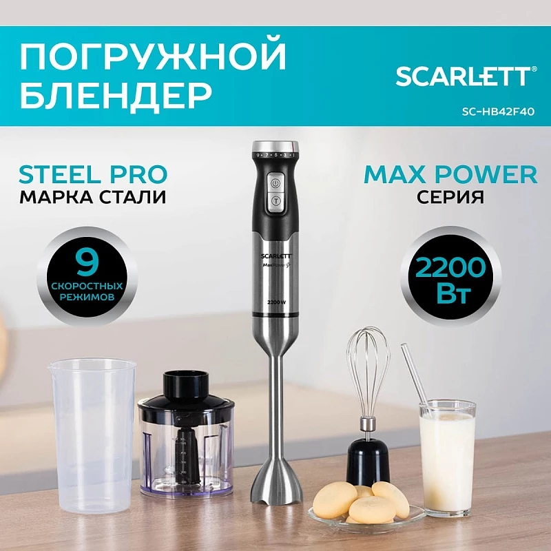 Современная кухня не может обойтись без качественного и функционального блендера, и погружной блендер Scarlett SC-HB42F40 — отличный пример такого устройства. Этот блендер 3 в 1 идеально подходит для измельчения, взбивания и смешивания, что делает его незаменимым помощником в приготовлении различных блюд. Дизайн и общие характеристики С первого взгляда Scarlett SC-HB42F40 впечатляет своим современным и стильным дизайном. Корпус выполнен из металла и пластика, что придаёт ему прочность и долговечность. Цвет сталь выглядит классически и легко вписывается в любой кухонный интерьер. Длина электрошнура в 1 метр достаточно удобна, однако в больших кухнях может понадобиться более длинный шнур. Этот блендер имеет мощность 2200 Вт, что не может не радовать. С такой мощностью он способен справляться с самыми трудными задачами. В сочетании с 9 скоростными режимами и режимом TURBO, этот блендер позволяет точно подбирать необходимые настройки для любых продуктов. Одним из главных достоинств Scarlet