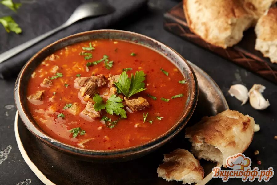 Суп харчо – это традиционное грузинское блюдо, которое имеет древние корни и богатую историю. В переводе с грузинского языка полное название харчо («дзрохис хорци харшот») означает «суп из говядины» или «говяжье мясо для харчо». Этот ароматный и острый суп был придуман в Грузии, где он считается одним из самых популярных и любимых национальных блюд. История супа харчо уходит корнями в глубокую древность, когда грузинские кулинары разрабатывали рецепты из самых доступных продуктов. Основными ингредиентами супа являются говядина, рис, томаты, лук, чеснок, специи и зелень. Готовят его долго и тщательно, чтобы достичь насыщенного вкуса и аромата. Суп харчо часто подают с красным перцем и чесночным соусом – это добавляет ему пикантности и остроты. Порции:6 Мякоть говядины500 г Вода2.5 л Круглозёрный рис90 г Репчатый лук1 головка Чеснок8 зубчиков Томатная паста100 г Аджика25 г Уцхо-сунели2 ч. л. Молотый кориандр1 ч. л. Кинза1 пучок Петрушка1 пучок Соль1/2 ч. л. Лавровый лист3 шт. Мясо для ха