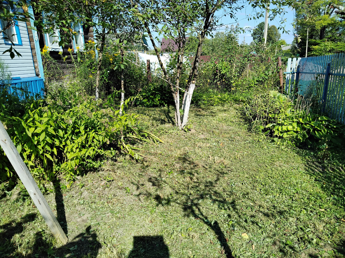 Вчера занимались уборкой в палисаднике: скосили траву, обрезали сухие ветки, спилили одну старую вишню .