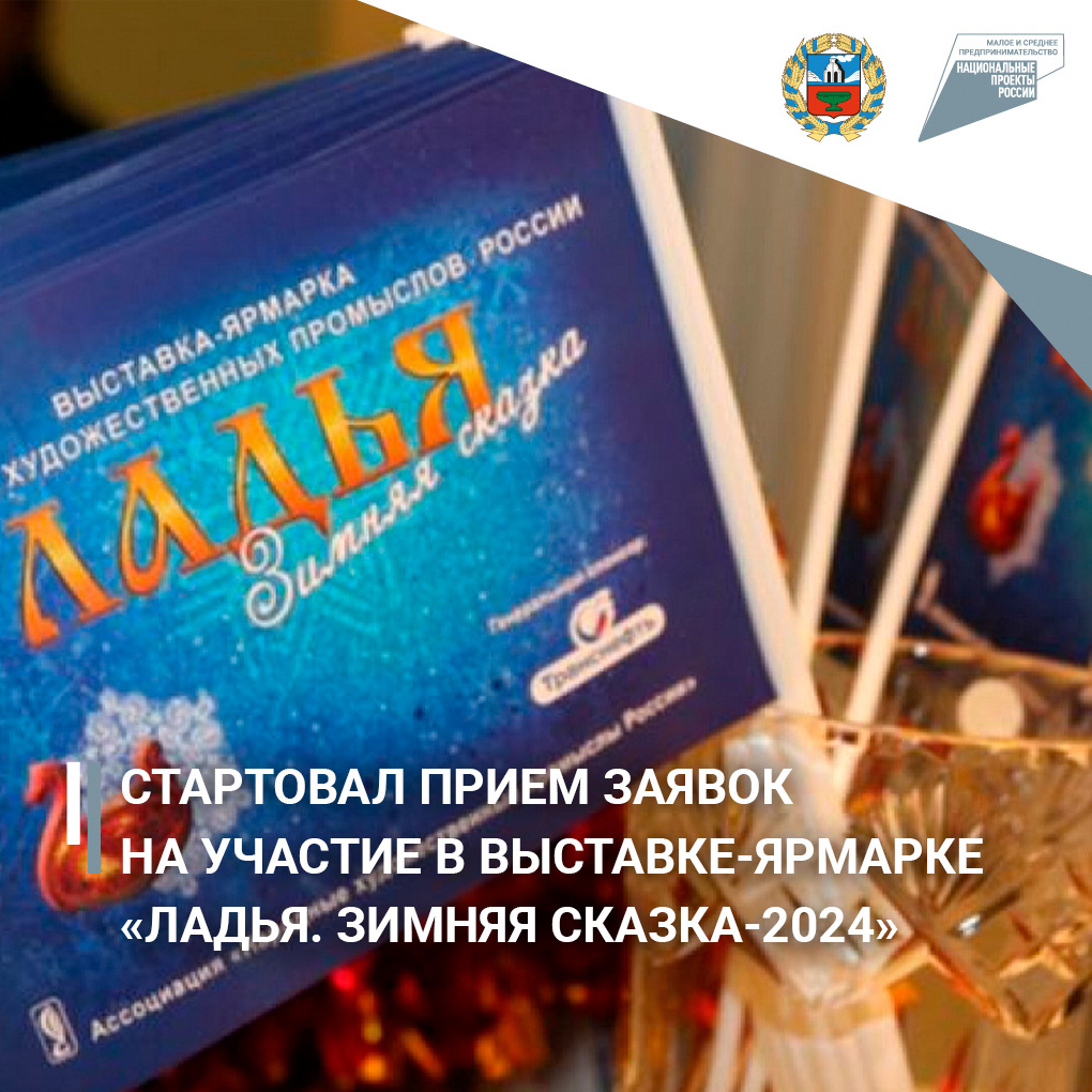 Центр «Мой бизнес» приглашает мастеров и ремесленников региона принять участие в коллективном стенде на выставке-ярмарке «Ладья. Зимняя сказка-2024» в рамках нацпроекта «Малое и среднее предпринимательство». Центр формирует делегацию для участия в 36-й выставке-ярмарке народных художественных промыслов «Ладья. Зимняя сказка-2024», которая пройдет с 18 по 22 декабря 2024 года в ЦВК «Экспоцентр» (г. Москва, Краснопресненская наб., 14). Это крупнейшее в России событие, организованное Ассоциацией «Народные художественные промыслы России» при поддержке Министерства промышленности и торговли РФ, Министерства экономического развития РФ, Торгово-промышленной палаты РФ и Российского фонда культуры. Выставка откроет свои двери в канун Нового года и представит продукцию сотен организаций промыслов, мастеров и художников со всей России, а также участников из стран ближнего зарубежья. К участию приглашаются субъекты малого и среднего предпринимательства, а также самозанятые граждане Алтайского края