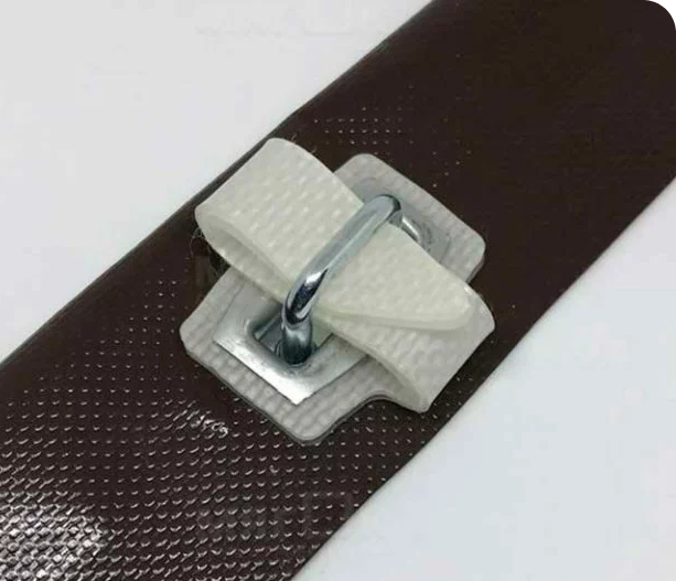 Скоба состоит из овального люверса и застёжки. Поворотом на 90* мягкое окно закрепляется в проёме. Это надежное и долговечное крепление: пружинный механизм застёжки исключает случайный поворот и крепко прижимает кант к стене. Скоба изготовлена из полиамида, она не сломается на морозе, и не выгорит на солнце. Она также имеет пружинный механизм, что обеспечивает надежную фиксацию. 3. Крепление "Французский замок"
