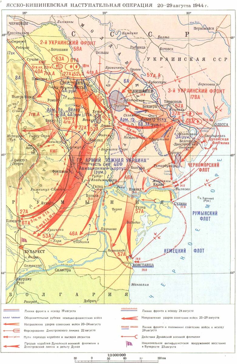 Советские войска между тем продолжали наступление на трех главных стратегических направлениях: измаильском (приморском), фокшанском и карпатском. Соединения 3-го Украинского фронта, овладев всем побережьем Дуная от Измаила до Черного моря, продвигались к румыно-болгарской границе. 29 августа войска фронта вступили в Констанцу – главную военно-морскую базу Румынии. Главные силы 2-го Украинского фронта, стремительно преодолев «Фокшанские ворота» (проход между Восточными Карпатами и Дунаем), к утру 30 августа во взаимодействии с румынскими войсками освободили Плоешти, а на следующий день вступили в Бухарест.