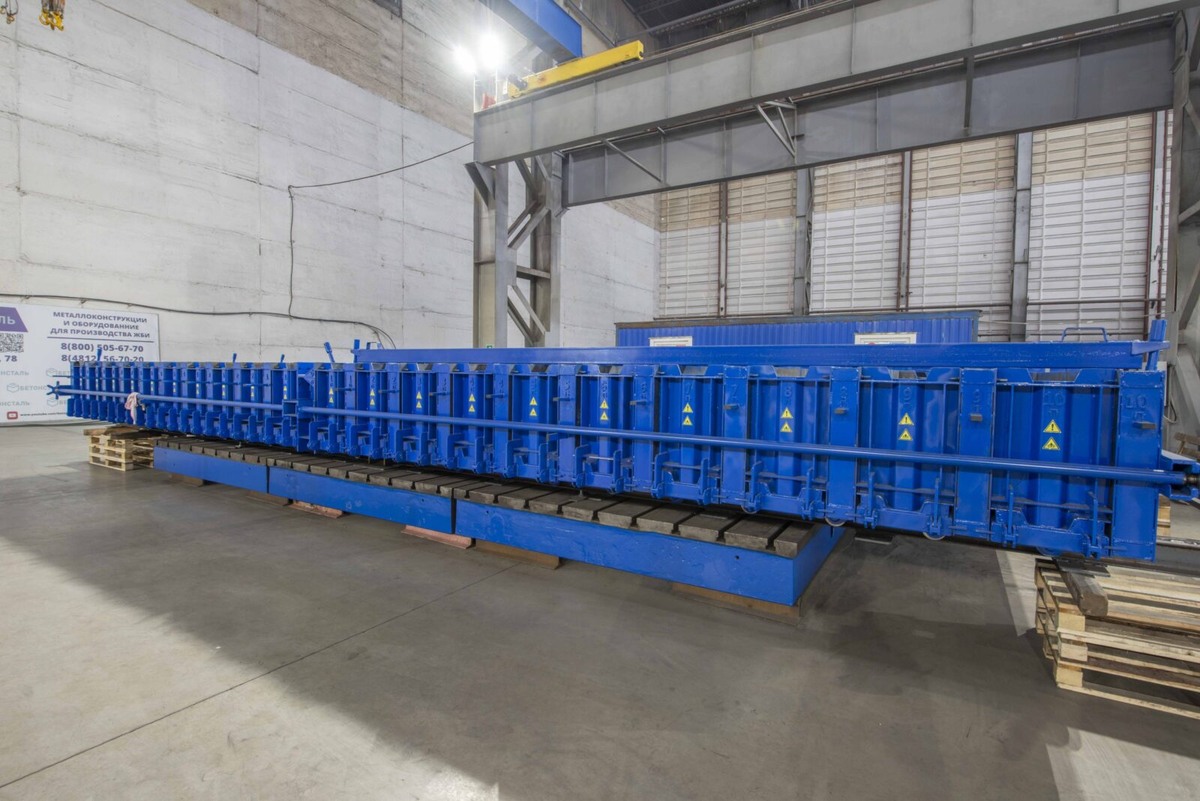 Кассетная установка для производства стеновых блоков из легкого бетона. На данном оборудовании возможно формование до 40 блоков за одну производственную смену. Регулировка по толщине изделий позволяет выпускать максимально возможную номенклатуру изделий при быстрой переналадке. К преимуществам данной формы можно отнести: точность геометрических размеров готовых изделий, быстрая распалубка и подготовка отсеков к формовке, легкая переналадка отсеков под выпуск различных изделий.