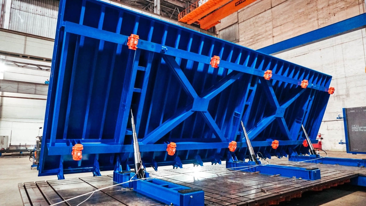 Поворотные вибростолы предназначены для производства многослойных наружных жби панелей, а также других плоскостных изделий. Выпуск двух видов поворотных вибростолов: без обогрева и с обогревом, где в качестве теплоносителя используется обогрев паром, горячей водой, или термомаслом. Тепловой контур расположен максимально близко к формующему листу. Телескопические гидроцилиндры выдерживают угол опрокидывания стола до 80 градусов, что обеспечивают легкий съем готового изделия. Подъем стола за 60 секунд. Возможность регулировки как продольного так и торцевого борта по высоте от 100 мм до 400 мм. Для работы столов в тандеме предусмотрена соединительная вставка. Произведена опрессовка системы обогрева до 10 бар. Для более точной сборки и сварки используются немецкие стапеля SIEGMUND. Пульт управления позволяет контролировать гидравлическую систему. Поворотные столы позволяю производить большую часть вида ненапряженных изделий, используя магнитные борта. Благодаря чему, так пользуются наибол