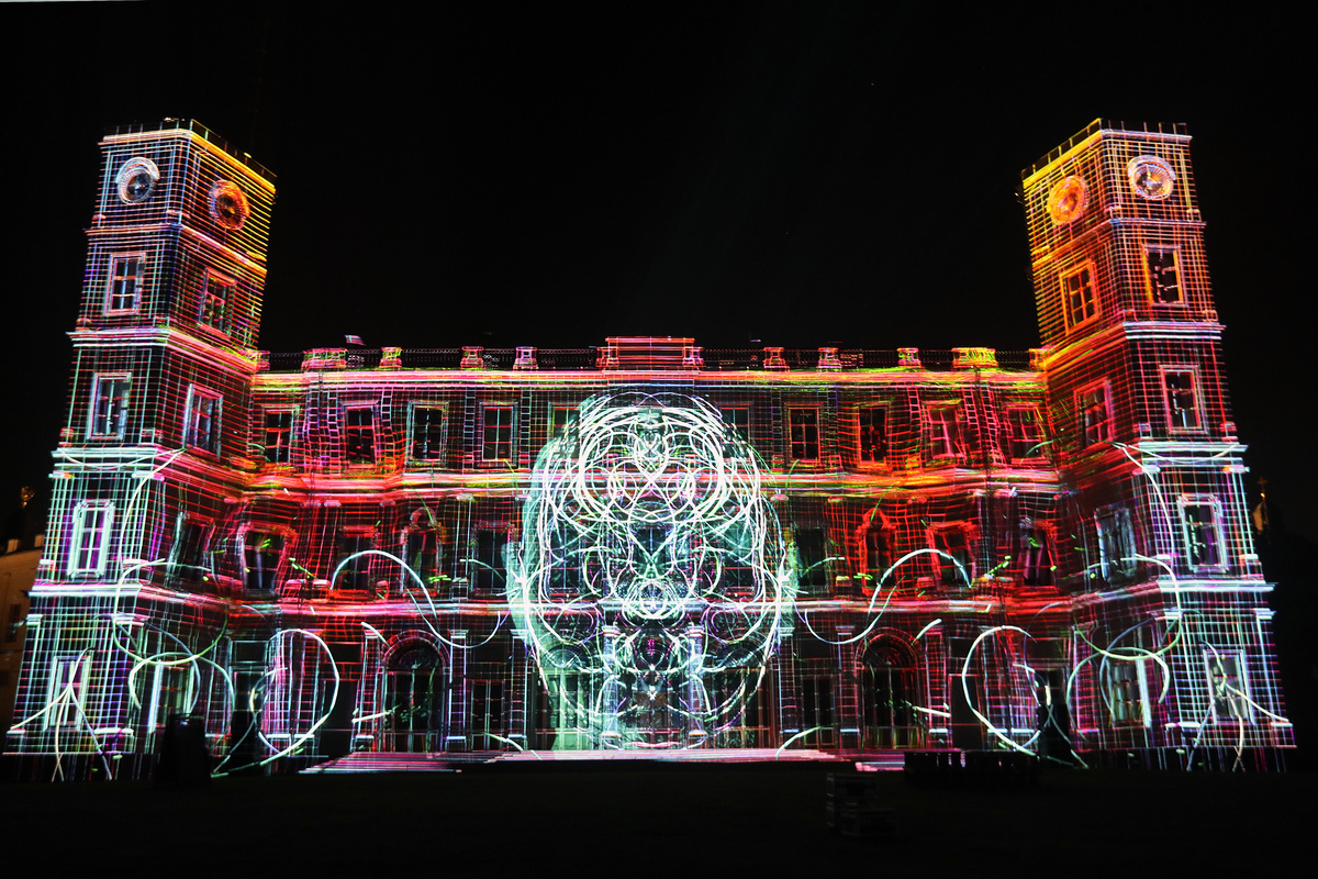 Стены с окнами в закрытом дворе привычно для мэппингов расползаются и наклоняются, ходят ходуном, исторгают слонов и носорогов (отсыл к гобелену Павла I в замке) и окрашиваются разными цветами в контрастных сочетаниях. «Лего!» — бросают вслух местные фотографы, видя игру красно-синих деталек разных форм. На самом деле почти угадали: работа венгерской студии EPER называется FRAGMENTS vol.2. Венгры — одни из немногих зарубежных участников фестиваля в этом году. Кроме них, в подборке мэппингов на фасаде (туда можно попасть, пройдя через дворец) показывают кислотных цветов анимацию Visionarium из Индонезии, работы из Испании и Китая. Еще одна работа китайских авторов — в парке, на Цветочной горке. Там можно потанцевать в лучах аудиовизуальной инсталляции Ethereal Generation, которая реагирует на движения человека и меняет форму и цвет яркого светового пятна, окруженного цветами.
