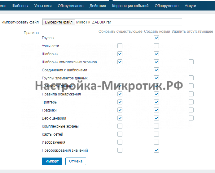 Указываем rar архив и делаем импорт Далее в настройках узла указываем этот шаблон и отключаем лишние. В моем заббиксе это выглядит данным образом: https://xn—-7sba7aachdbqfnhtigrl.xn--p1ai/zabbix СЕТЕВЫЕ УСЛУГИ