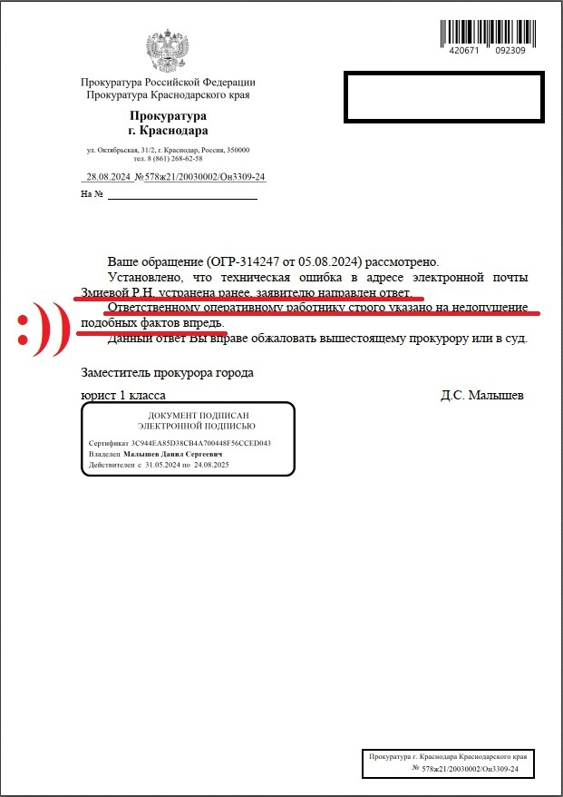 Здравствуйте, уважаемые гости и подписчики моего канала! Не перестаю удивляться правовому нигилизму со стороны органов прокуратуры. Ранее, я хотел помочь гражданке Р.Н. Змиевой получить её же ответ, направленный мне на электронную почту ошибочно, а то ждёт и думает, что ответ ей не дан. Подача обращения в органы прокуратуры № 4418058737. Действия. Заявление получено ведомством. Сегодня в 12:03. Обращение на портал «Госуслуги» от 5 августа 2024 г. по факту ошибочного направления ответа заявителю от 30 июля 2024 г., полученного мною аж от 5 августа 2024 г. под № 1451ж-2024/20030002/Он2857 и направления данного ответа нужному гражданину