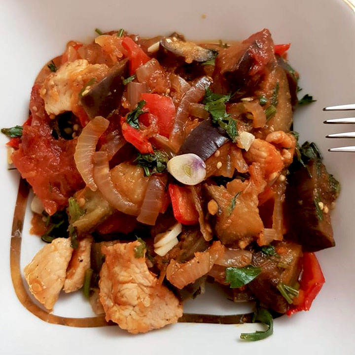 1. Нарезаем филе индейки (400 г) маленькими кусочками. Разогреваем сковороду с добавлением растительного масла. Обжариваем индейку. 2. Нарезаем баклажаны и перец (по 2 шт.) кубиками. Выкладываем к филе и продолжаем жарить в течение 10 минут. Затем измельчаем морковь, шинкуем лук и добавляем в сковороду. 3. Солим и оставляем тушиться, периодически помешивая, на 7-10 минут. Затем добавляем нарезку из помидоров и томим до полной готовности. 4. Посыпаем зеленью (у меня – кинза и базилик) и чесноком. Примерное КБЖУ на 100 г - 96/5,7/6,1/4,2. + 9 фото Рецепт на странице Автор рецепта – Aik Dan © Почтенный возраст Online и Рецепты для диабетиков