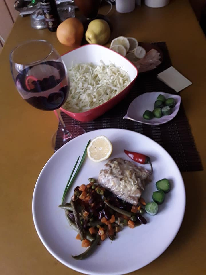 Филе скумбрии под сыром, салат из капусты с яйцом и тушеные овощи