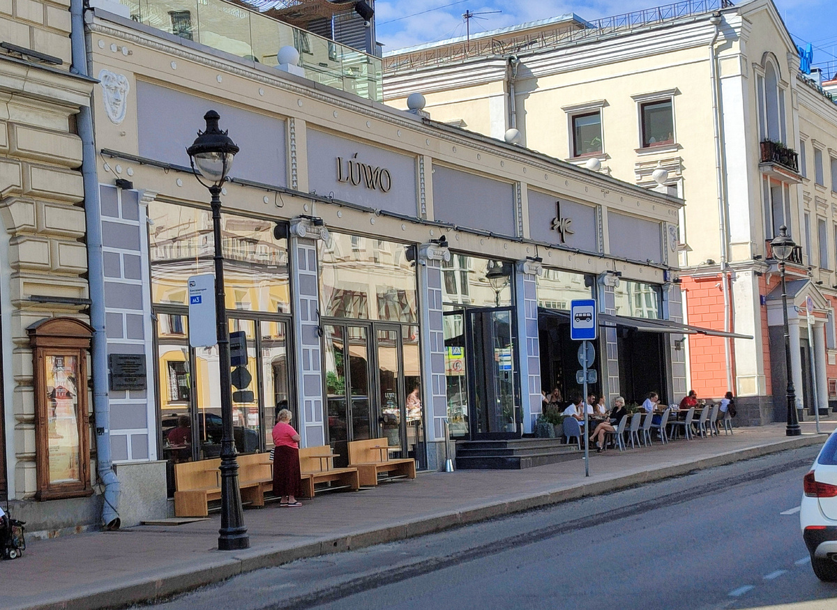 На Вознесенский переулок смотрит одноэтажное здание (№15 с.1), глядя на которое у прохожих вопрос возникает. Как это на такой дорогой земле современную кафешку поставили?