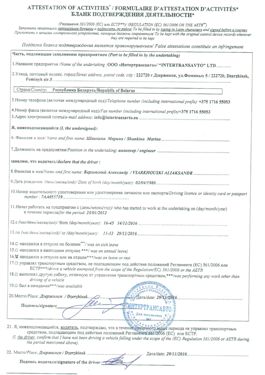 -В строке 20 необходима печать и подпись инженера, выдавшего письмо. -В строке 22 необходима подпись водителя. -в начале каждой смены: заполнять распечатку с обратной стороны (распечатанную - подробных сведении автомобиля), имя, фамилию, номер карты (или водительского удостоверения), дата, роспись, номер тягача, место в начале смены, километраж в начале смены; -в течении рабочей смены: в местах остановки или стоянки заполнять режим труда и отдыха; -в конце смены: заполнять место в конце смены, километраж и пройдённое расстояние. Отдых до 12:00, далее с 12:00 до 20:00 доезд до тягача: Необходимо письмо отдыха по время окончания отдыха - до 12:00 в строке 13 письма отдыха: Если в экипаже у один водитель работает по чипу, а второй по распечатке: после рейса, водителю работавшего по чипу необходимы копии распечаток водителя, работавшего без чипа (по распечаткам) - для документального подтверждения работы в экипаже. Принятые распоряжения на основании которых разрешена поездка без карт