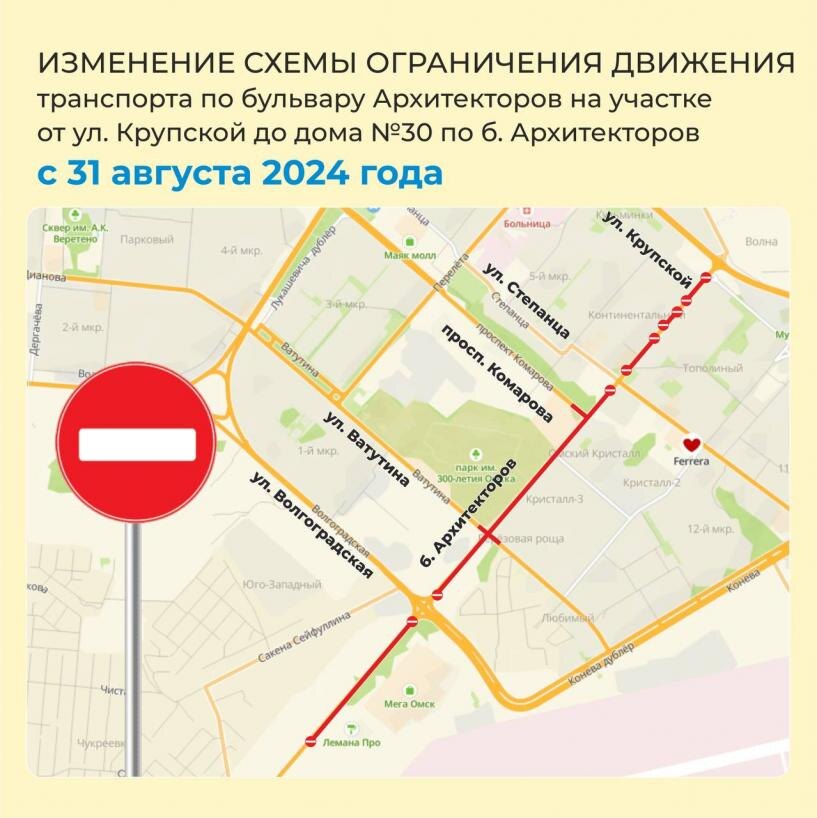 С 31 августа возобновляется движение через перекрёсток бульвар Архитекторов — улица Волгоградская. Для движения будут доступны две полосы в каждом направлении. Напомним, перекрёсток был отремонтирован в рамках реконструкции бульвара Архитекторов. В связи с открытием перекрёстка меняется приоритет движения на пересечении улиц Волгоградской и Сейфуллина. Теперь главной дорогой снова станет улица Волгоградская. Левый поворот с Волгоградской на Сейфуллина останется. А с улицы Сейфуллина можно будет поворачивать только направо в сторону Конева. Для движения в сторону Лукашевича оборудован разворот в районе первого въезда на территорию ТЦ «Мега». Будет также скорректирована работа светофора на пересечении улицы Конева и съезда к ТЦ «Мега», время проезда увеличат для потоков машин, движущихся по улицам Конева и Волгоградской. Ремонт бульвара Архитекторов на всем его протяжении продолжается. Специалисты работают в две смены. Завершить реконструкцию дороги должны к концу текущего года.