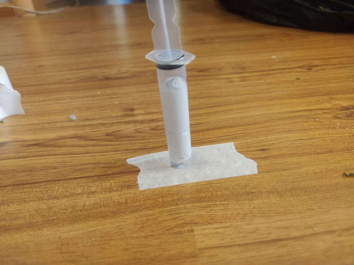 📌Через шприц в отверстие впрыскивается подготовленная масса. Шприц оставляется на месте, чтобы равномерно распределить массу (возможно понадобится добавить еще)