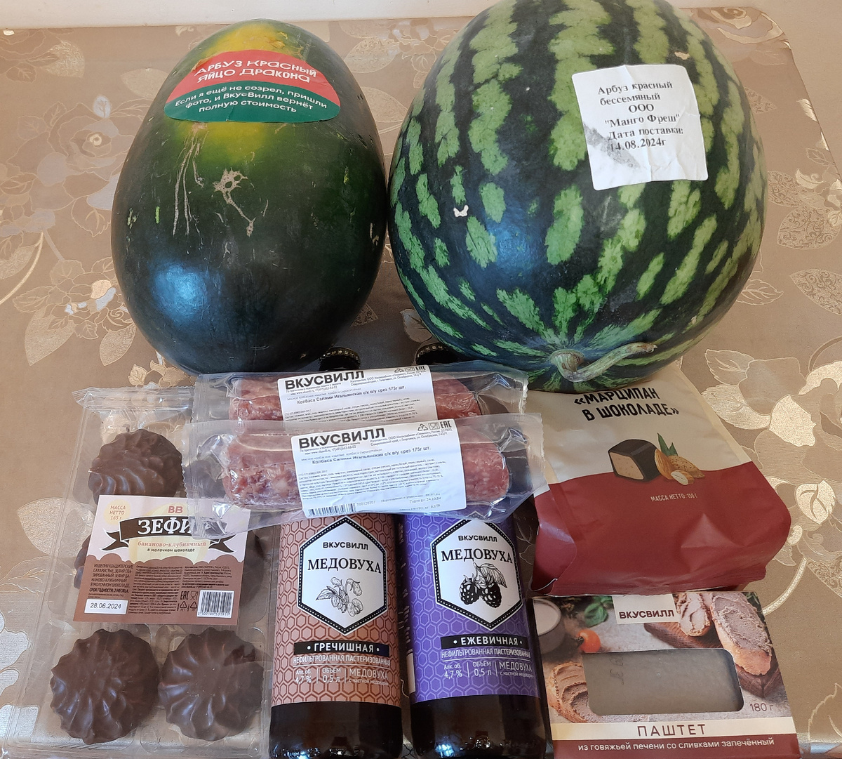 Для начала хочу сказать, что заказ оплачивался бонусами от Сбера. Как же это удобно! У нас баллы копятся, а списывать на Мегамаркете мне не нравится. Да еще и те продавцы, у которых я заказывала какие-то нужные вещи, а не просто чтобы что-то купить – отказались от их бонусной программы! Так что Вкусвилл в плане бонусов сделал шикарный подарок! Только алкогольные напитки покупайте отдельным чеком, на них списать бонусы нельзя. Медовуха тоже относится к этой категории. - Арбуз красный бессемянный 148р за 1 кг Этот арбуз увезли родителям. Так что про вкус ничего сказать не могу. Родителям понравился, сказали сладкий. - Арбуз красный "Яйцо Дракона" 148р за 1 кг А вот этот арбуз пробовали сами. И не особо сладкий((( Жаль((( Вот сколько бы статей не писали, как правильно выбрать арбуз – стучать, нюхать, смотреть на пятнышко и всё такое… А всё же арбузы и дыни – это лотерея! Иногда берешь – и он шикарен! А иногда – слабовато… Не знаю людей, кто определяет арбузы на 100% всегда. - Зефир банан