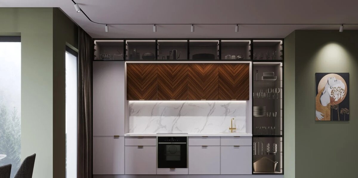Для удобства эксплуатации и гармонии в интерьере лучше не устанавливать гарнитуры больше 2,4 м. Если в помещении высокие потолки (более 3 м), специалисты рекомендуют использовать гипсокартонные конструкции для уменьшения высоты. Это не только облегчит доступ к верхним шкафам, но и позволит встроить подсветку.