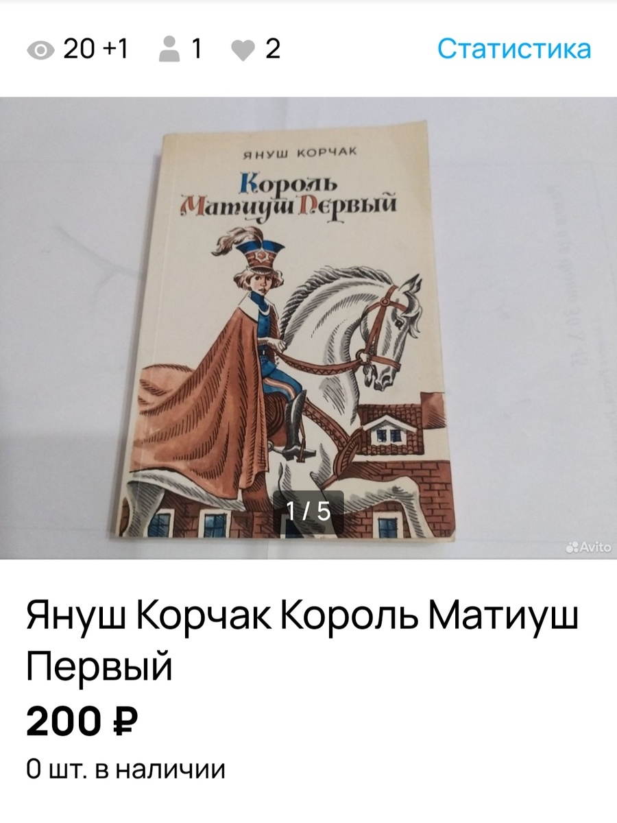 Продалась книга Януша Корчака "Король Матиуш Первый", издательство Правда, 1989. Януш Корчак — польский педагог, детский писатель, врач. Человек с большой буквы. Он любил своих воспитанников так, что шагнул вместе с ними в вечность – принял смерть вместе с детьми в газовых камерах концлагеря Треблинка. Основа воспитания Януша Корчака – счастливое детство. И это не просто общая формулировка. Счастливое детство – это уважение прав и свобод ребёнка, а также абсолютное доверие к нему. Цитаты Януша Корчака: «Детей нет, есть люди». «Не жди, что твой ребёнок будет таким, как ты, или таким, как ты хочешь. Помоги ему стать не тобой, а собой». «Всё, что достигнуто дрессировкой, нажимом, насилием, — непрочно, неверно и ненадёжно». «Люби своего ребёнка любым — неталантливым, неудачливым, взрослым. Общаясь с ним, радуйся, потому что ребёнок — это праздник, который пока с тобой".