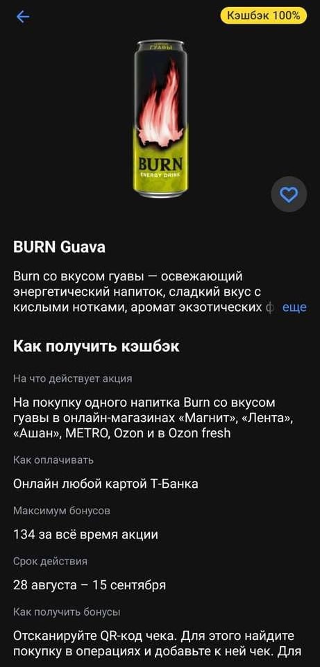 Как насчет выпить энергоса и провести день максимально продуктивно? Тут как раз Т-Банк предлагает залутать банку Burn'а со вкусом гуавы со 100% кэшбэком. Ближе к делу. Если у вас все еще нет ни одной карты от желтого банка, то оформляем дебетовую «Тинькофф Black https://www.tbank.ru/baf/1WBkodmTCre (бонусом мы так же получим 1 000₽ кэшбэка при тратах в 3 000₽ и 500 рублей на карту после оформления, если пластик уже есть, то пропускаем этот пункт). Подобные предложения с халявой у «Т-Банка» появляются очень часто, поэтому рекомендую не тупить и получить карту. Авторизуемся в «Тинькофф Мобильный банк» и ищем предложения с кэшбэком, как на скриншоте выше. Топаем в любой оффлайн или онлайн магазин, которые принимают участие в акции и приобретаем ништячок, после чего загружаем чек в приложение. Деньги вернутся на карту в течение 10 дней.