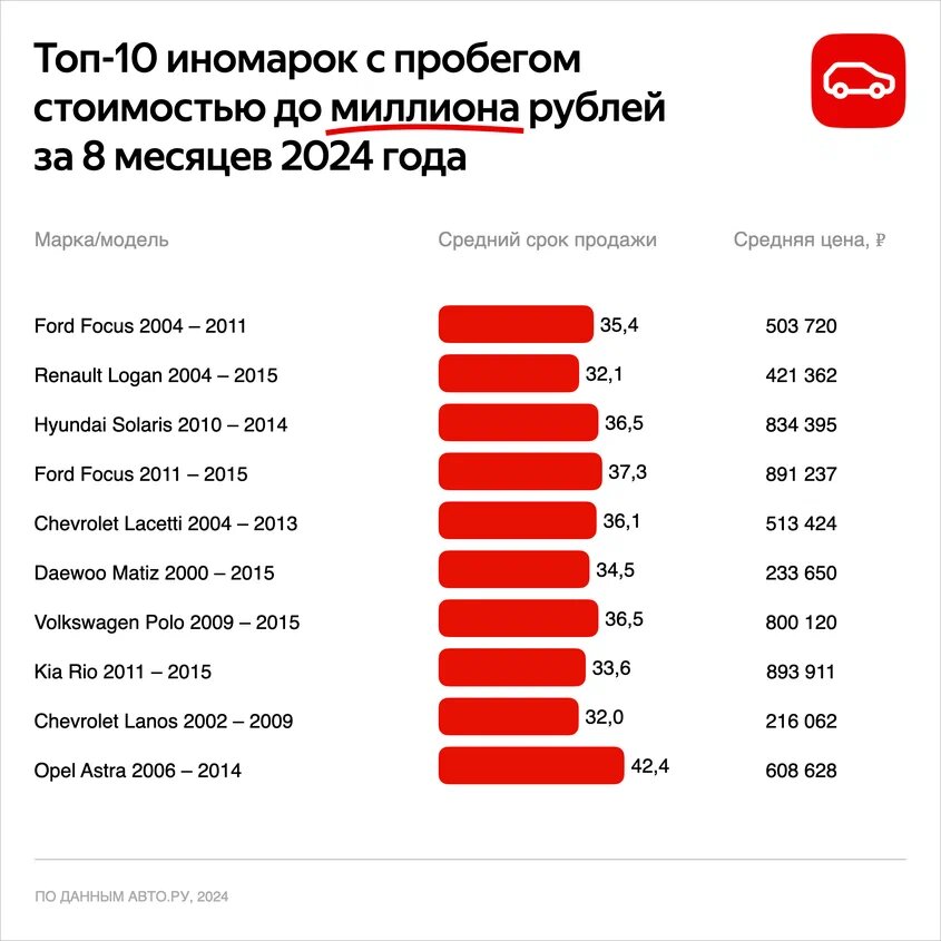 Наиболее востребованной подержанной иномаркой в ценовом сегменте до 1 миллиона рублей у российских покупателей стал Ford Focus второго поколения. К такому выводу пришли аналитики Авто.ру, изучив базу объявлений за период с начала 2024 года. Китайские бренды в этом сегменте занимают меньше 3 процентов. В топ-10 самых популярных недорогих иномарок с пробегом попали сразу два Ford Focus — версия модели, выпускавшаяся в период с 2011 по 2015 годы, заняла четвёртое место. На второй по покупательскому интересу позиции значится Renault Logan, на третьем — Hyundai Solaris. Аналитики отмечают, что в лидеры сегмента вышли главным образом модели, в разные годы становившиеся официальными бестселлерами российского рынка. Ценовой сегмент до 1 миллиона рублей назван самым массовым: на его долю приходится более 60% предложений. Чаще всего в пределах этой стоимости продают автомобили японских (30%), немецких (19%) и южнокорейских (18%) марок. Среднестатистический представитель сегмента — седан с бензин