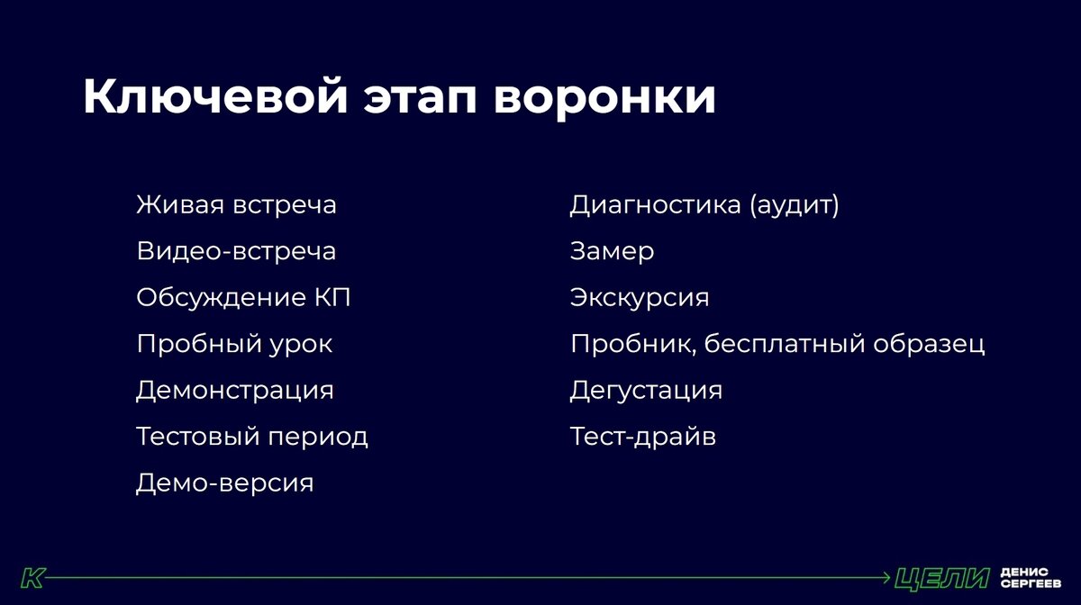 Много лет назад я пренебрегал этим термином и считал, что в моих бизнесах этого этапа просто нет. Однако я ошибался. В B2B-услугах КЭВом является видео-встреча с демонстрацией возможностей индивидуально под заказчика. А какой КЭВ в ваших продажах? Ключевой этап воронки - это главный промежуточный этап в процессе продаж, который увеличивает вероятность совершения сделки. Все касания с клиентом, которые вы совершаете, - это создание доверия к вашей компании и к продукту. Это может быть реклама в интернете, заход на сайт, звонок, встреча, видео-созвон, наглядная демонстрация, тест-драйв. Этап, который создает максимальное доверие, на котором можно сделать индивидуальное предложение клиенту и эффективно отработать его возражения называется ключевым этапом воронки. Это не просто звонок клиенту или коммерческое предложение (КП). Это что-то более существенное. Например, встреча от 20 минут, запланированный звонок для обсуждения КП. Это такой этап, на котором действительно нужно пор