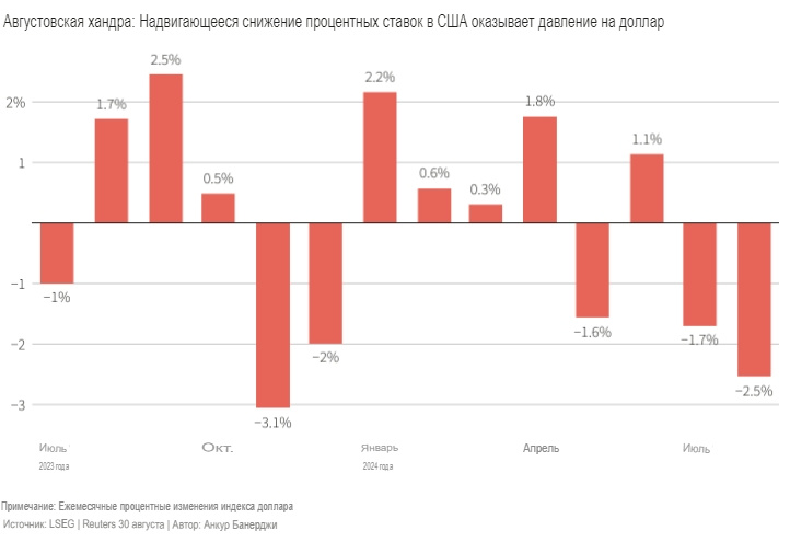 Доллар готов прервать 5-недельную полосу потерь, в то время как юань растет В пятницу доллар держался около недельного максимума по отношению к основным аналогам, на пути к прерыванию пятинедельной полосы потерь после того, как сильные экономические данные заставили инвесторов сократить ожидания агрессивного снижения процентных ставок Федеральной резервной системы. Китайский юань вырос до самого сильного уровня с июня 2023 года, а евро мало изменился, так как данные по инфляции подтвердили обзор, опубликованный в четверг, о том, что ценовое давление в еврозоне быстро ослабевает. Индекс доллара США, измеряющий курс валюты к корзине из шести основных валют, не изменился и составил 101,40 после роста на 0,36 % в четверг и достижения максимума с 22 августа на отметке 101,58. Вчера в США вышли данные о том, что валовой внутренний продукт (ВВП) во втором квартале вырос на 3,0% в годовом исчислении, что является пересмотром в сторону повышения по сравнению с показателем 2,8%, который был опуб