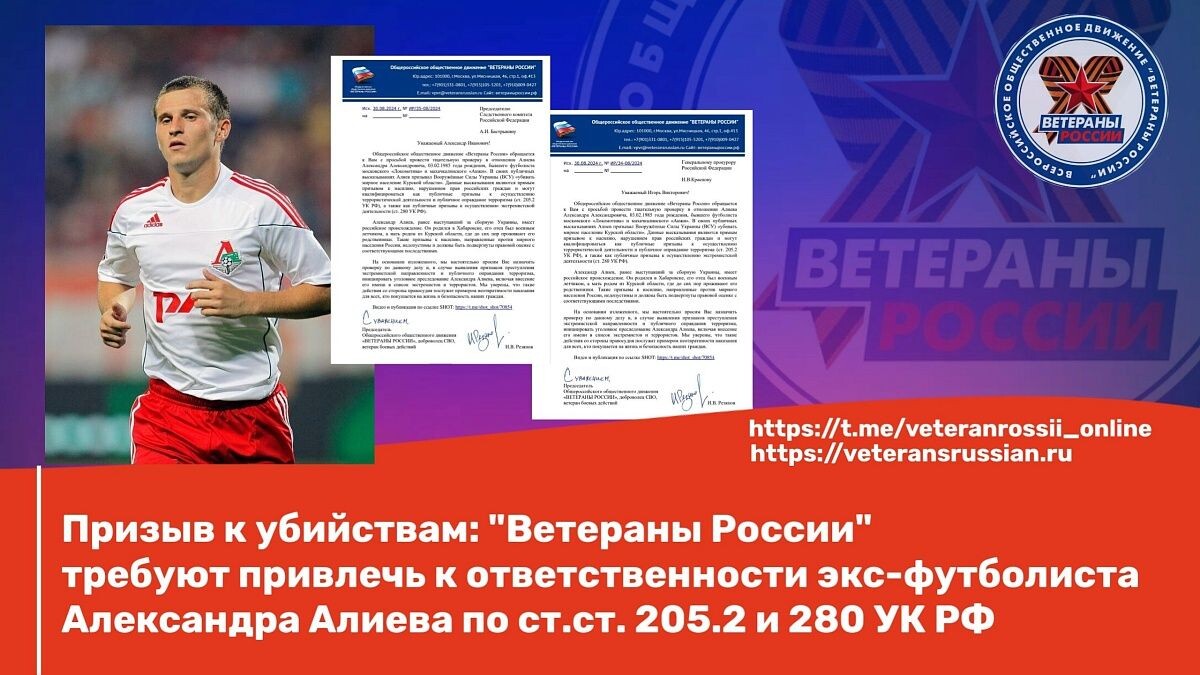 Общероссийское общественное движение «Ветераны России» обратилось к Председателю Следственного комитета России Александру Бастрыкину и Генеральному прокурору РФ Игорю Краснову с просьбой провести проверку в отношении Александра Александровича Алиева, экс-футболиста московского «Локомотива» и махачкалинского «Анжи». В своих публичных высказываниях Алиев призывал Вооружённые Силы Украины (ВСУ) «убивать мирное население Курской области». Данные высказывания являются прямым призывом к насилию, нарушением прав российских граждан и могут квалифицироваться как публичные призывы к осуществлению террористической деятельности и публичное оправдание терроризма (ст. 205.2 УК РФ), а также как публичные призывы к осуществлению экстремистской деятельности (ст. 280 УК РФ). Александр Алиев, уроженец Хабаровска, родившийся 3 февраля 1985 года, вызвал возмущение общественности своими призывами в адрес Вооруженных сил Украины (ВСУ) «убивать мирное население Курской области». В своих публичных заявлениях