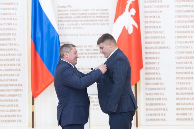 Торжественная церемония состоялась сегодня в администрации региона, в Зале Воинской и Трудовой Славы. Ордена и медали ученым, врачам, соцработникам, деятелям культуры, общественникам, промышленникам и госслужащим вручил губернатор Волгоградской области Андрей Бочаров. - Вас, представителей самых разных профессий, объединяет мощная созидательная сила, которую вы направляете на достижение общественно значимых целей и решение актуальных задач. Каждый на своем месте, при поддержке своих трудовых коллективов, вы приумножаете самые лучшие воинские, трудовые, профессиональные, общественно-патриотические традиции, которыми славится наша страна, наша легендарная героическая сталинградская земля, — приветствовал героев дня глава региона. Указом Президента РФ, а также Постановлением губернатора Волгоградской области наград Российской Федерации и региона удостоены 20 человек. В их числе – участник СВО Максим Веденеев, которому вручили медаль «За доблесть и мужество». Андрей Бочаров поблагодарил за