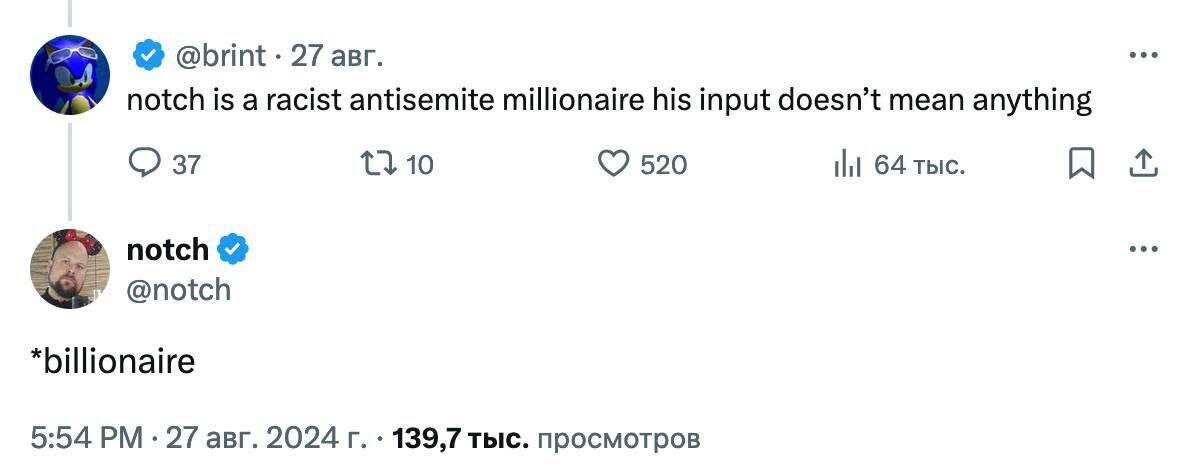 В ответ бог кубоноидов уточнил лишь одну деталь: он миллиардер, не миллионер. #minecraft #нотч #notch #майнкрафт