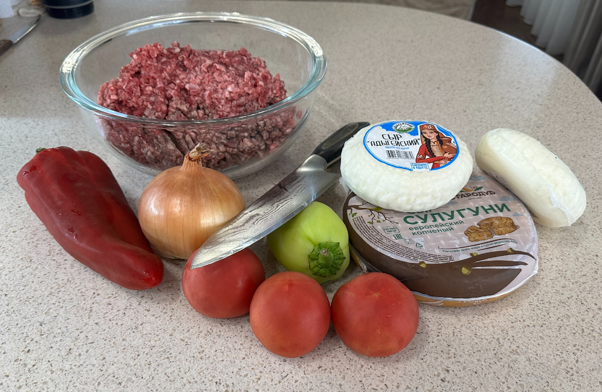 Смотрите, что нам с вами на рынке надо купить: муки хорошей надо, молока обязательно, яичек приличных с десяток, дрожжей к каким привыкли, сыра какого-нибудь мягкого и к нему столько же сулугуни, говядины или баранины с килограмм, сливок двадцатипроцентных, помидоров-шмомидоров приличных, перца болгарского пристойного, да лука репчатого, да петрушки, а с остальным на месте разберемся, честное слово - и я вам обещаю, что сегодня у вас на столе так вкусно будет, что вы ум свой съедите и мне спасибо скажете: за идею, за то, что раздразнил, да за то, что у вас выходной не зря прошел. А если чего у меня в кадр не поместилось - извините.