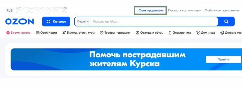 Заходим на сайт: https://www.ozon.ru. Нажимаем на надпись «Стать продавцом»