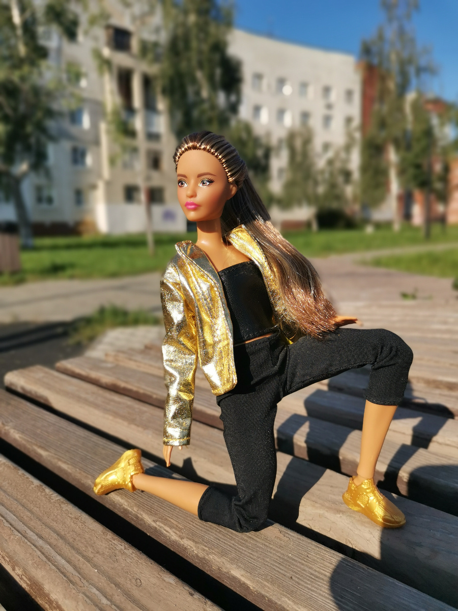 Сияние золота редко нечасто встретишь в кукольном гардеробе, поэтому поразить количеством не получится😁 В Долл-тауне нашлось всего 2 золотых наряда. Времени отчаянно мало, поэтому снимала сегодня по пути в садик😁 Когда отвела сына, на обратном пути поснимала одну барышня, а когда забрала - другую. Первой была Карла. Ее золотые тени так и манили примерить ей сияющую курточку из софийского набора. Черный дружит с золотом, поэтому Карла надела черные топ и легинсы, а из обуви нашлись золотые кроссовки. Сначала пробовали снимать в тени, как обычно. Но потом решили, что золото должно сиять на солнце! А второй была недавно сменившая имидж Милли. Она примерила бронзово-золотой комбинезон, тоже от карапуза. Он тоже сияет на солнце 🌟 А ягодки шиповника подчеркивают яркую помаду Милли. Из обуви для Милли мы подобрали красные ботильоны, также в тон яркой помаде. И уже дома две мои золотые модели сделали кадр вместе. Спасибо за внимание! ❤️❤️