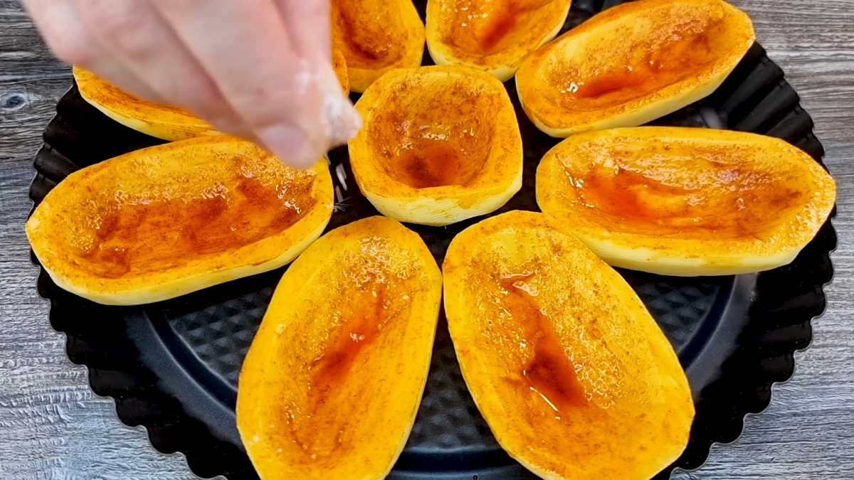 Картофель почистить, разрезать вдоль пополам и достать ложкой середину, как на фото. Подготовленный таким образом картофель выложить в форму для запекания и смазать соусом. Для соуса смешать 2 ст.л. растительного масла и