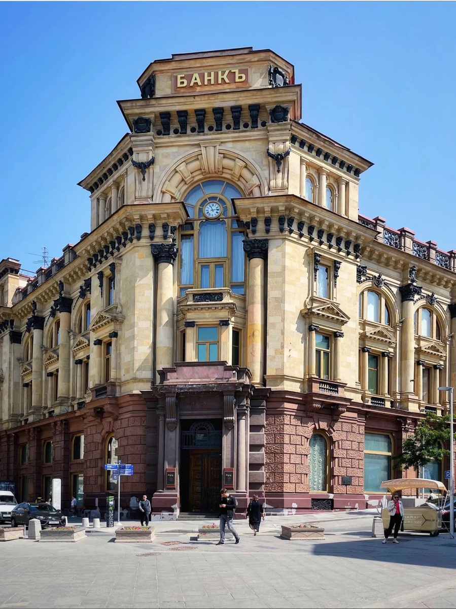 Красивейшее здание Московского международного торгового банка в стиле неоренессанс с элементами римского барокко было построено на углу Кузнецкого моста и Рождественки в 1898 году. А прежде на этом месте располагалась усадьба купца Ивана Григорьевича Фирсанова. Иван Григорьевич был из тех хватких людей, которые начав собственную торговлю с лотка, позже становились миллионерами. Но сегодня не об этом:) После смерти Фирсанова имение унаследовала его дочь Вера Ивановна. И летом 1895 года продала его руководству Московского международного торгового банка. Банк этот был основан Лазарем Соломоновичем Поляковым. Лазарь Соломонович (тайный советник, пожалованный потомственным дворянством) был создателем целого ряда российских банков и промышленных компаний. Например, он возглавлял Орловский коммерческий банк, Московский земельный банк и другие. В 1908 году, после экономического кризиса, Поляков потерял значительную часть своего состояния. Тогда провели ревизию и выявили многомиллионную задолже