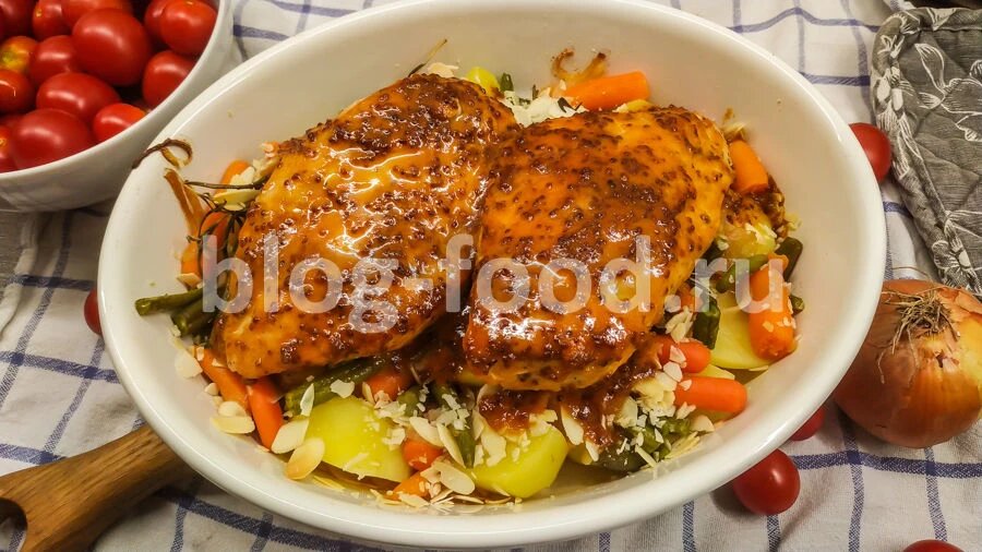 Всем привет. Сегодня приготовим комплексное блюдо — курицу с овощным гарниром. Всё сперва обжарим по отдельности, а потом запечём в духовке. Тут у нас бэби-морковка, но, естественно, можно взять обычную и порезать небольшими ломтиками. Продуктовый набор: Лук режем тонкими полукольцами. Картошку чистим, отвариваем в кипящей подсоленной воде 10 минут. Смешиваем уксус, обе горчицы, мёд, паприку, добавляем 5 ст. ложек растительного масла, щепотку соли, доводим до кипения, варим, помешивая, полминуты. Курицу солим, перчим по вкусу, обжариваем на сильном огне в небольшом кол-ве растительного масла по паре минут с каждой стороны, откладываем в сторону. В сковороду кладём лук, добавляем ложку растительного масла, жарим минуту... ...добавляем фасоль, морковь, убавляем огонь до среднего, жарим 5 минут, периодически помешивая. В форму для запекания выкладываем сварившуюся картошку, овощи, посыпаем листиками розмарина, миндалём, сверху выкладываем курицу, поливаем горчично-медовым соусом и отпра
