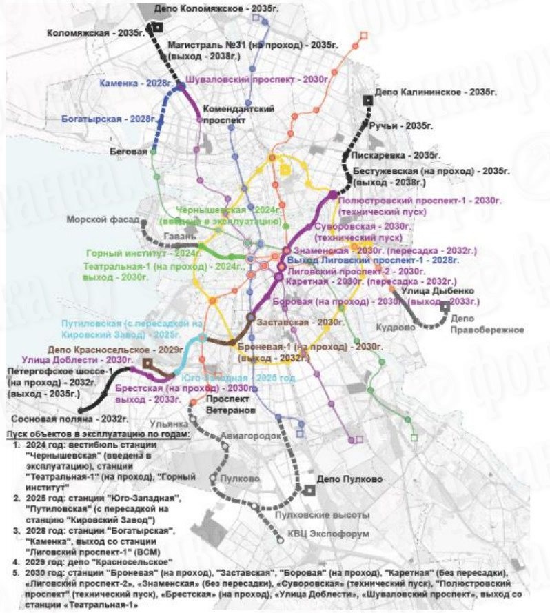 На строительство метро до 2030 года Петербург должен потратить 1,3 трлн рублей. Хотя бы полтриллиона ждут от федералов. По данным «Фонтанки», концепция развития метрополитена до 2030 года предусматривает строительство новых станций, а также реконструкцию и модернизацию действующих. Общий объем финансирования составляет 1,3 трлн рублей. На схеме, которая разработана для отраслевых совещаний, видны сроки для ввода станций. Можно обратить внимание, что некоторые из них будут работать «на проход» по несколько лет: это значит, что выходы с них построят позже, чем введут сам участок. Такая судьба, как известно, ожидает «Театральную», а также, как выясняется, ряд станций коричневой линии — «Боровую», «Броневую», «Петергофское шоссе», «Бестужевскую». За последнее время было опубликовано несколько версий по срокам ввода станций. Согласно этой, в 2024 году откроют участок «Спасская» — «Горный институт», в следующем — «Казаковская» — «Путиловская», в 2028 — «Богатырскую», «Каменку» и выход со ста