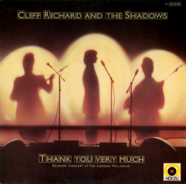 Здравствуйте, друзья. Есть в моей коллекции очень интересный альбом названные не замысловато - «Большое Спасибо». Но причина на то вполне обоснованная. Это обращение к фанатам группы «The Shadows» и само собой фанатам Клиффа Ричарда. Ведь мы помним, что Ричард кроме сольной карьеры успевал поучаствовать в действах группы. Так вот — это живое выступление в Лондоне на стадионе «Палладиум». Концерт уместился на один винил. Начинает Ричард, затем «The Shadows». И так они отыгрывают вперемежку. Длинно говорить нечего. Надо слушать. Желающие переходят по ссылке слушают и сохраняют в коллекции. Благодарю за внимание. Пока. - Cliff Richard And The Shadows – 1979 Thank You Very Much (Reunion Concert At The London Palladium) HÖR ZU – 1C 064-06 939, EMI – 1C 064-06 939 LP Germany