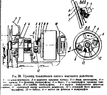 на муфте опережения впрыска топлива и ведущей полу-муфте привода топливного насоса; метки должны быть